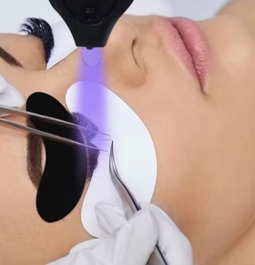 Onze UV-lamp systemen zijn ontworpen voor professioneel gebruik en belichten alleen de lijm, niet de huid of ogen. Tijdens de behandeling gebruiken we beschermende pads en apparatuur om contact met direct licht te minimaliseren.